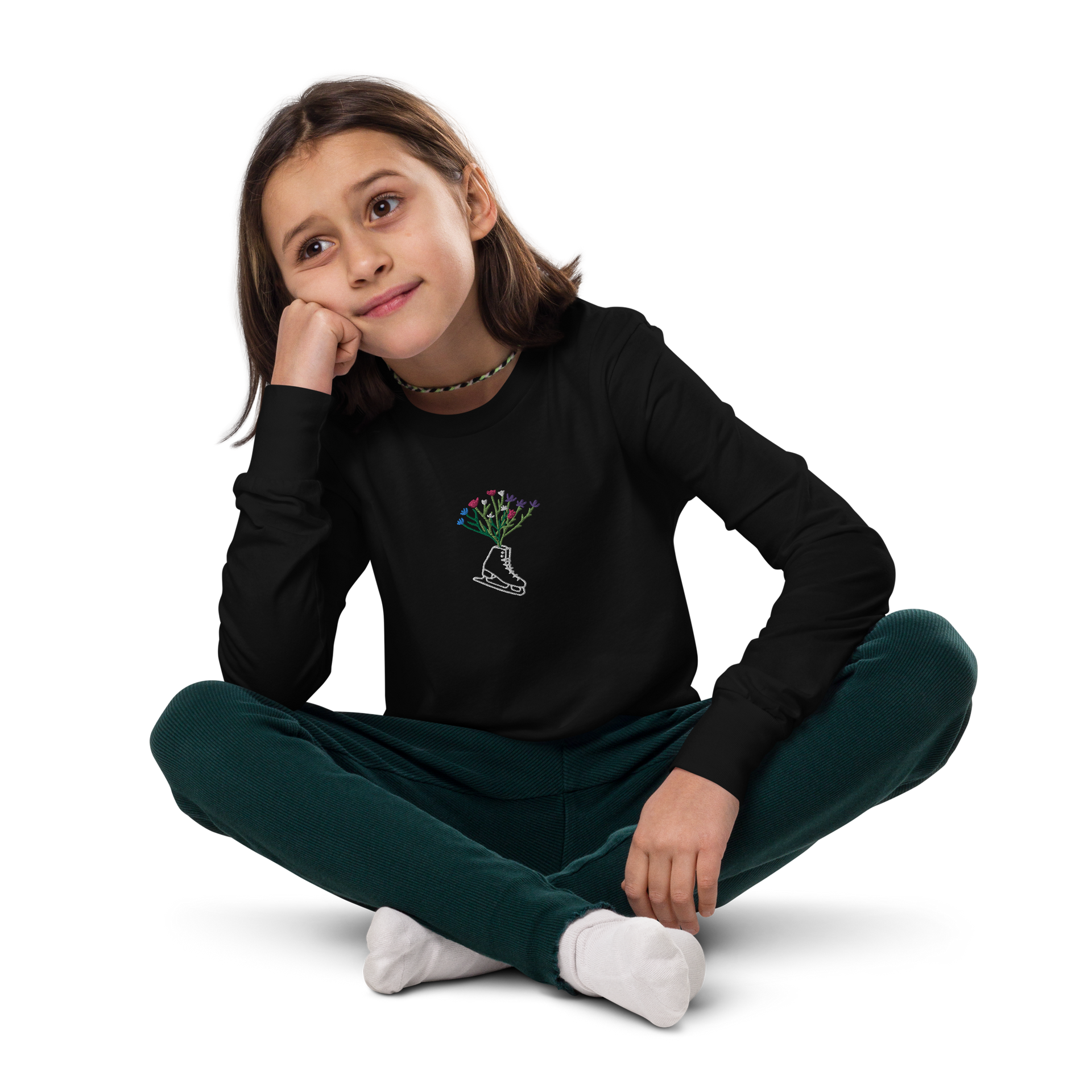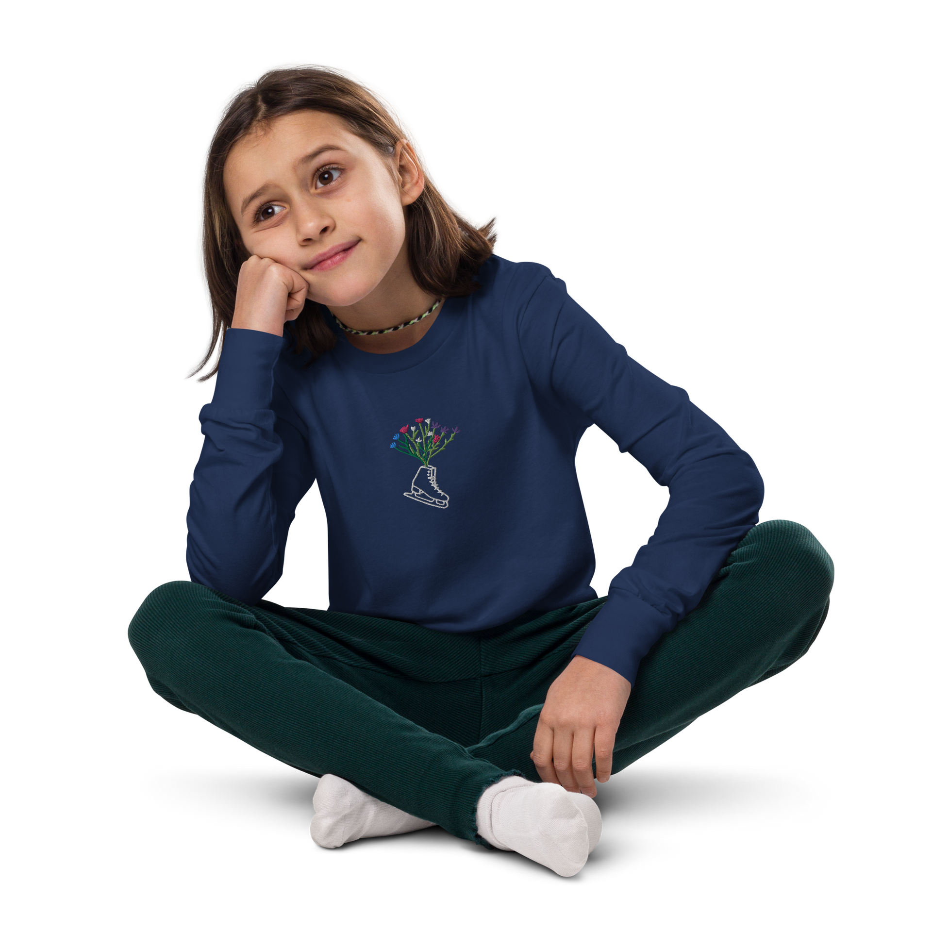 This adorable long sleeve t-shirt features an embroidered figure skating boot that blossoms with goodness, just like your skater. Made of airlume combed and ringspun cotton, which is known for its softness and durability. Your young skater is sure to love it!