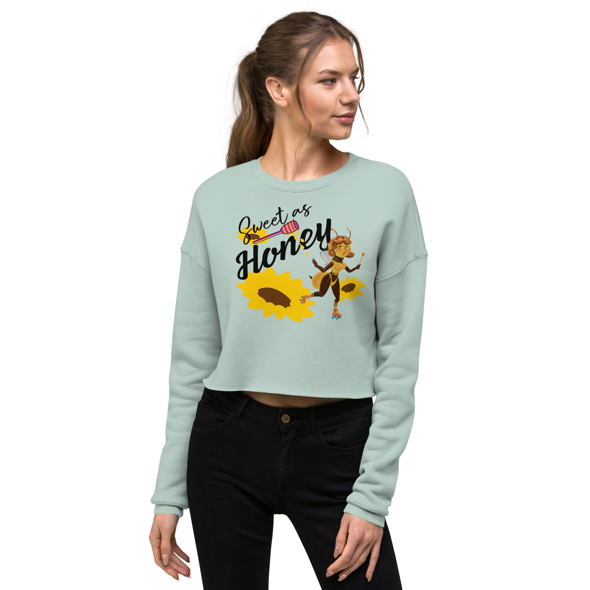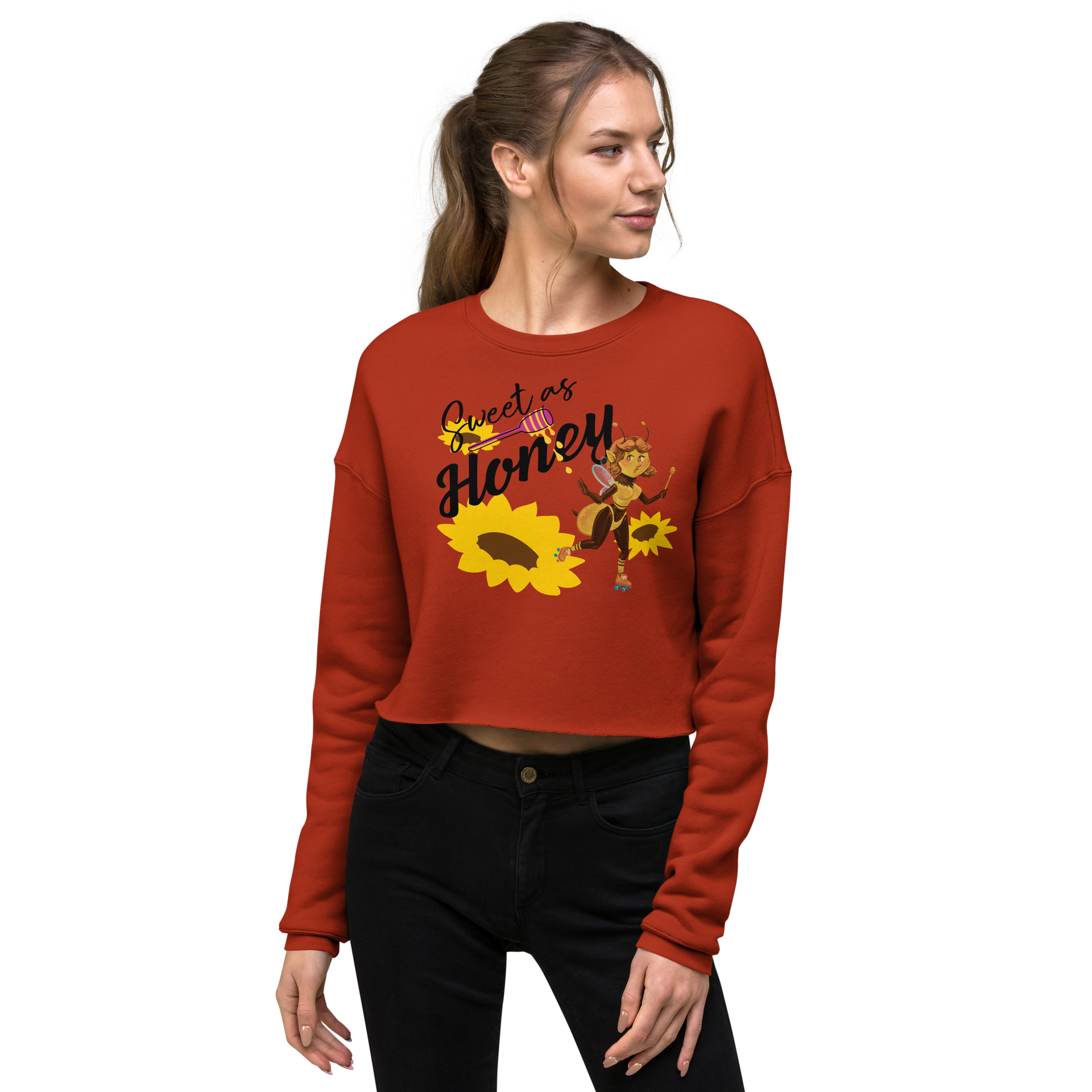 The Honey Bee Roller Skate Crop is the perfect combination of style and comfort. This adorable design is ready for whatever your day brings. Features a fashionable dropped shoulder cut with a ribbed crew neckline and the cutest little honey bee on roller skates! Fits true to size but you can size up for a larger fit.