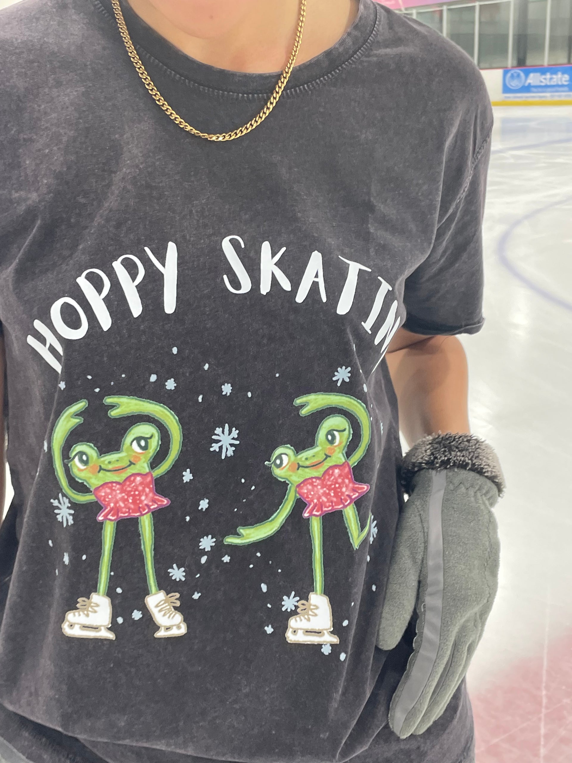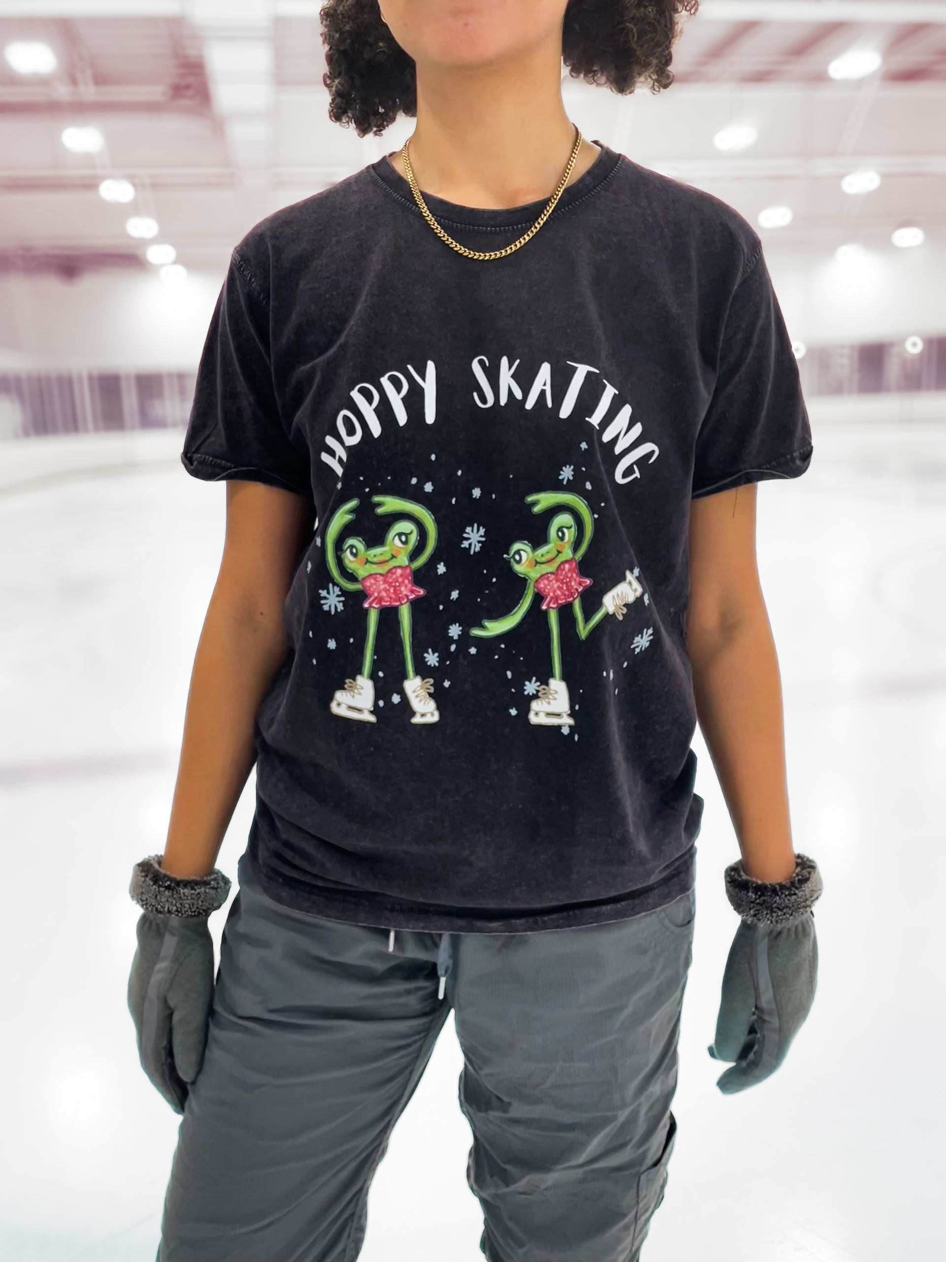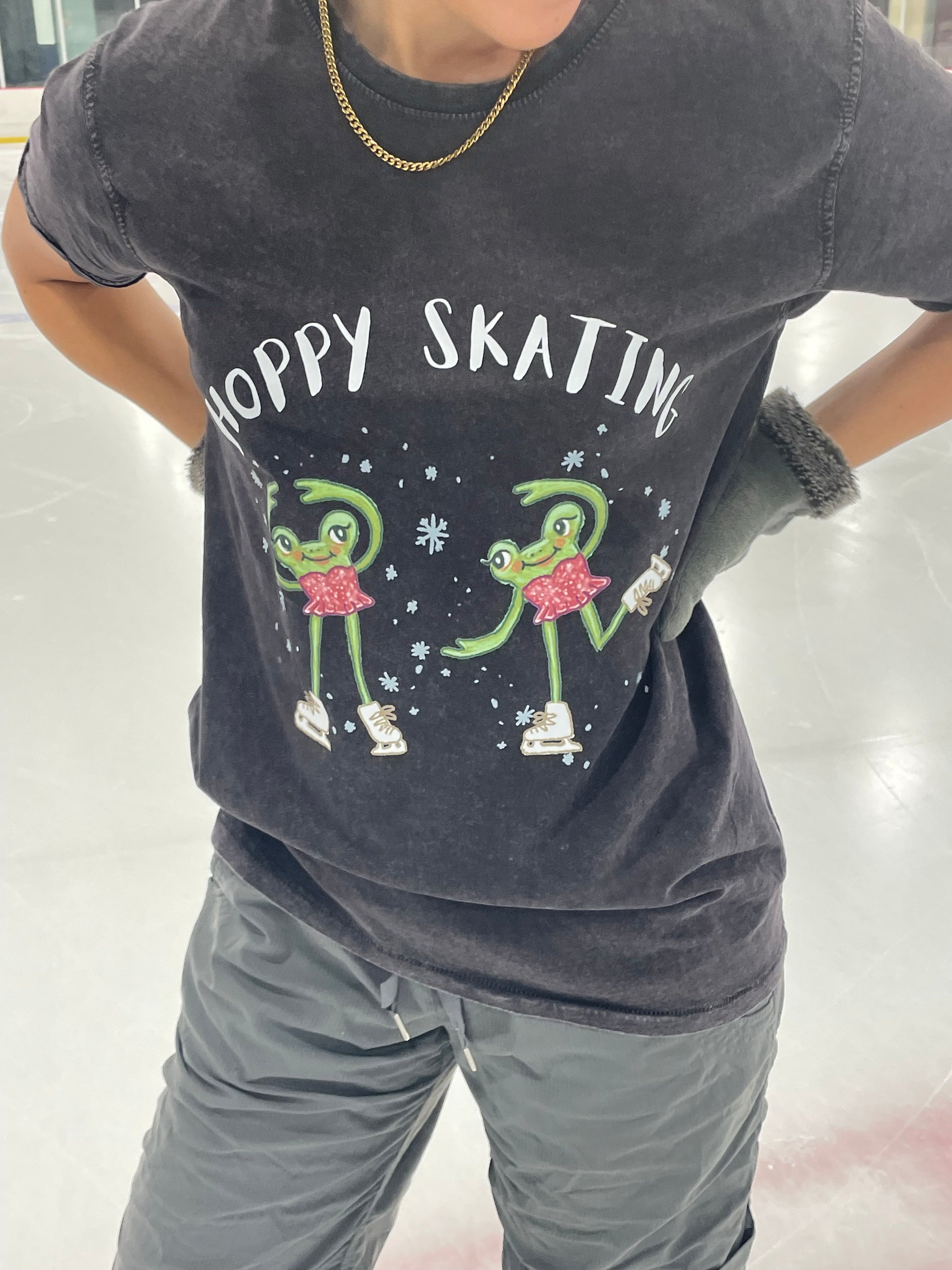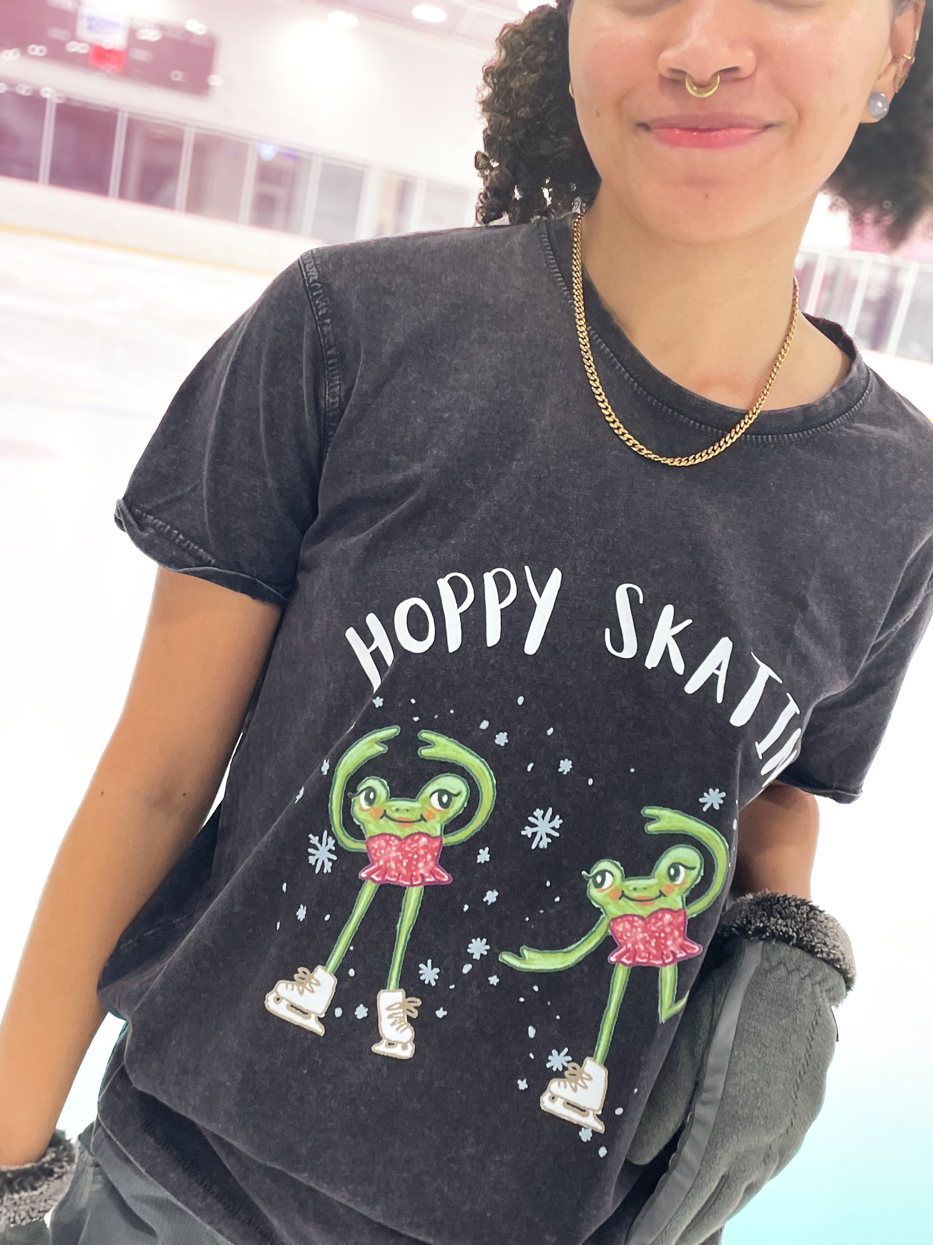 Showcase your love for figure skating in our adorable denim t-shirt that's soft and comfortable. Hoppy Skating is made out of 100% combed cotton and features two adorable frogs in ice skates. You're going to love it!